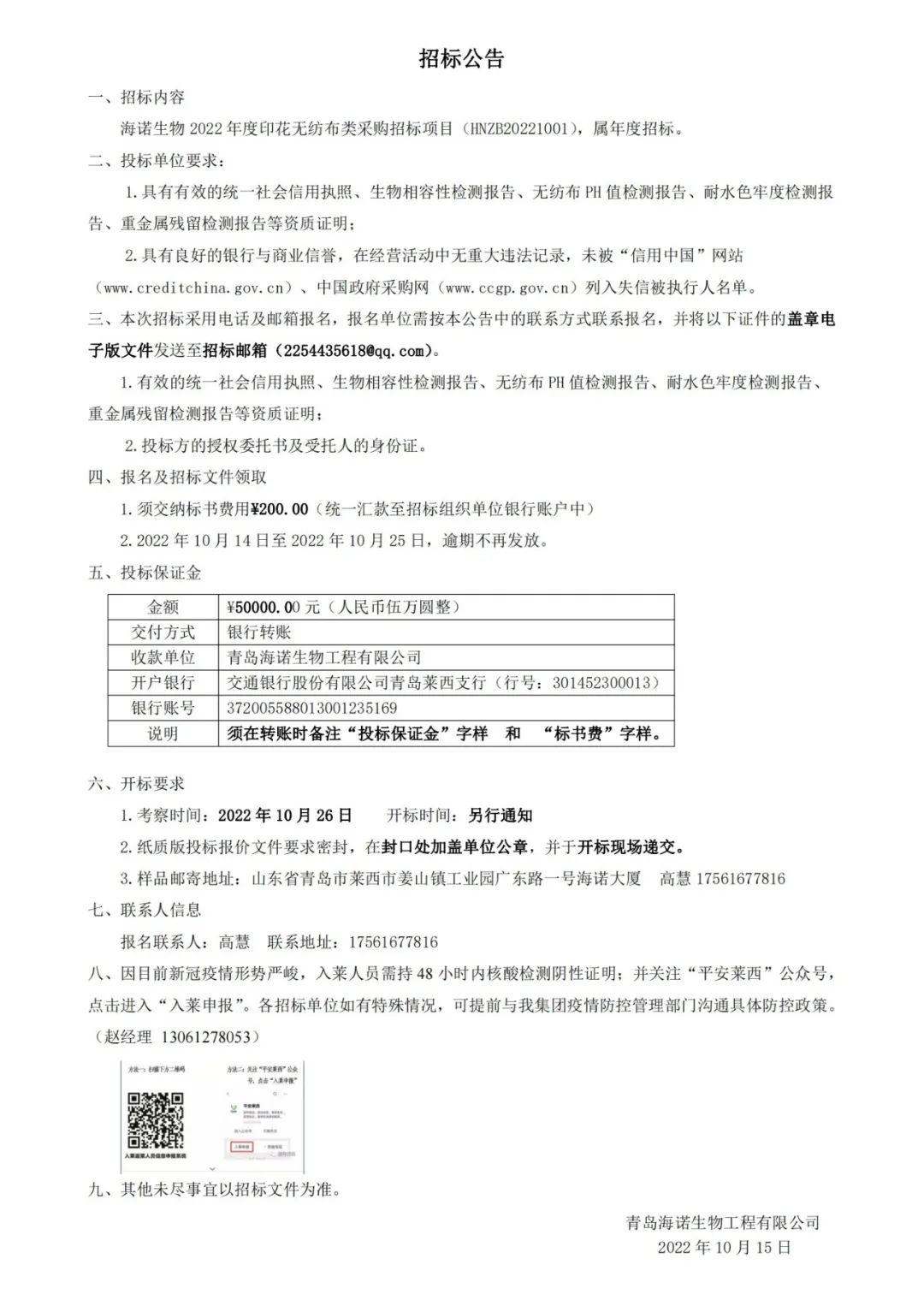 海諾生物 2022 年度印花無紡布類采購招標項目正式開啟
