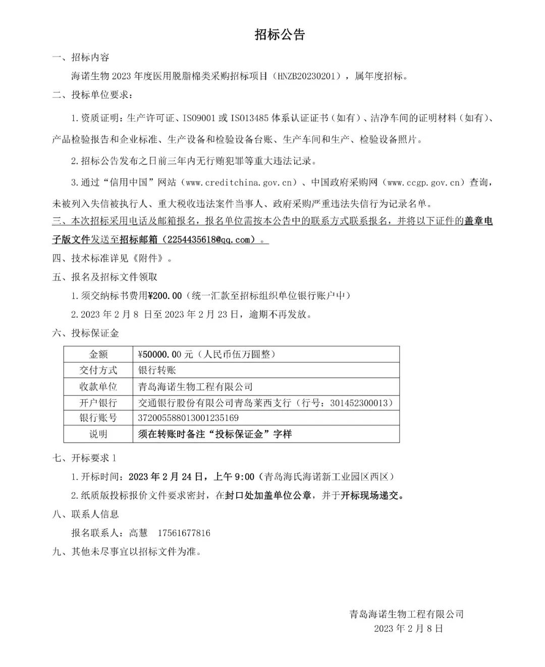 海諾生物 2023 年度醫(yī)用脫脂棉類采購(gòu)招標(biāo)項(xiàng)目正式開(kāi)啟